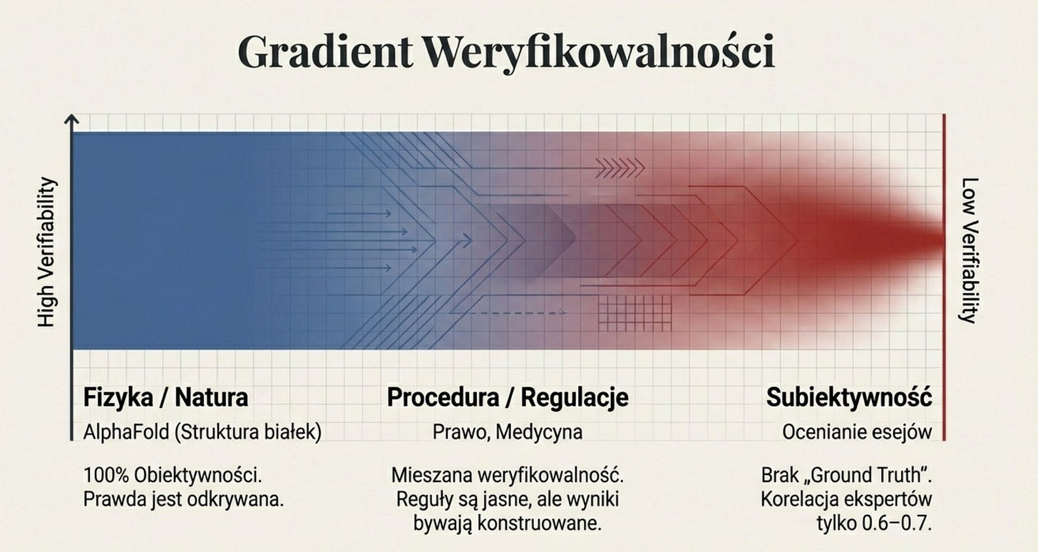 Albowiem odpowiedź leży w koncepcji weryfikowalności. Zadanie „napisz apelację” jest weryfikowalne w ograniczonym sensie: można sprawdzić, czy dokument ma poprawną strukturę, czy cytuje istniejące przepisy, czy argumentacja jest logicznie spójna. Ale zadanie „rozstrzygnij, kto ma rację w sporze między pielęgniarką a lekarką w kontekście zmieniających się norm społecznych” nie jest weryfikowalne w tym samym sensie – nie istnieje algorytmiczna funkcja nagrody, która mogłaby ocenić „poprawność” takiego rozstrzygnięcia.
