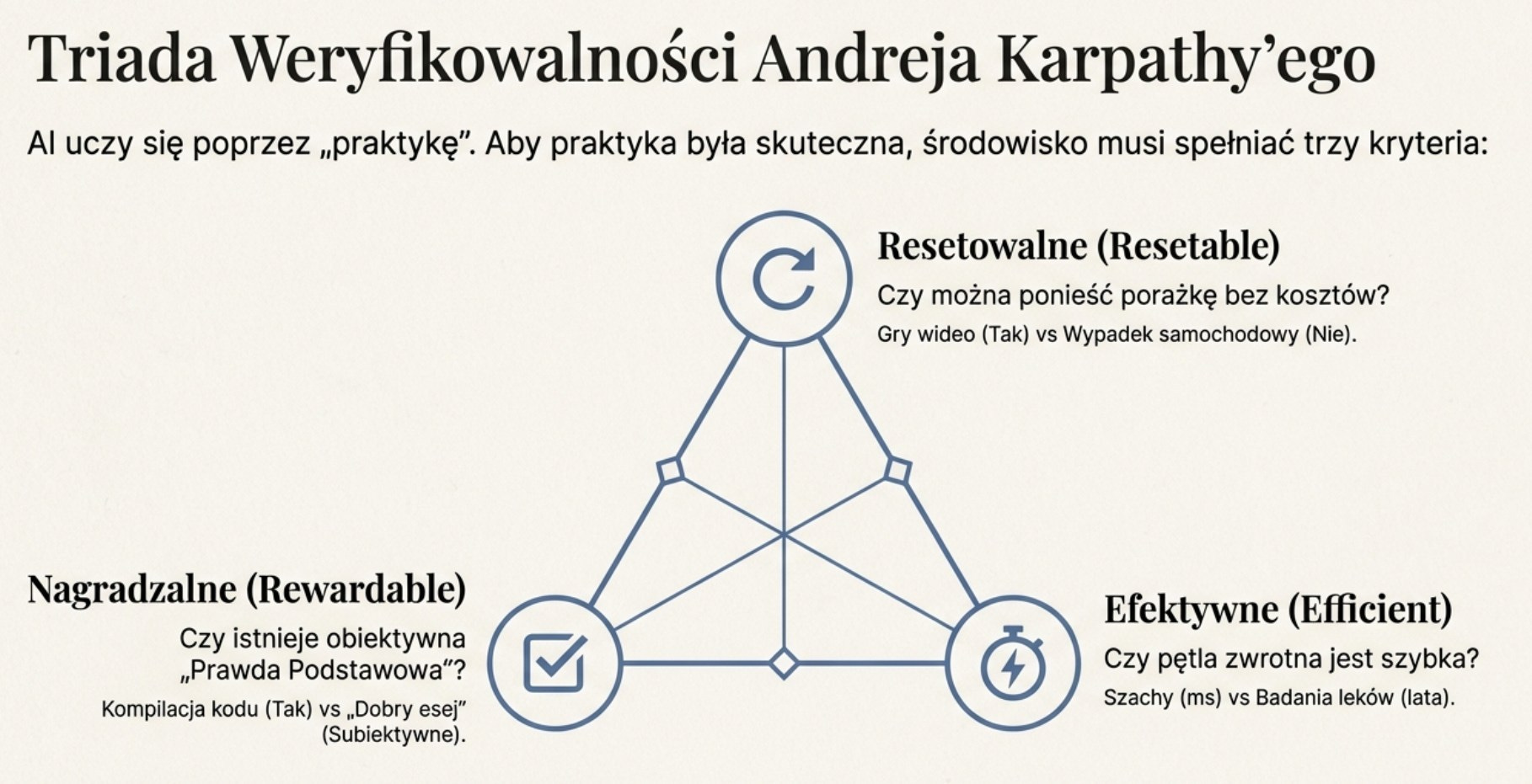 Definiuje on weryfikowalne środowisko poprzez trzy rygorystyczne kryteria. Po pierwsze, środowisko musi być resetowalne: możesz rozpocząć nową próbę od zera, bez żadnych kosztów ani konsekwencji. Jeśli AI rozbije prawdziwy samochód, eksperyment się kończy – samochód jest zniszczony, ludzie mogą być ranni, konsekwencje prawne i finansowe są realne. Jeśli rozbije samochód w symulacji, środowisko resetuje się natychmiast. Automatyzacja wymaga możliwości porażki miliardy razy bez konsekwencji. To wyjaśnia, dlaczego AI osiąga nadludzkie wyniki w grach (szachy, Go, gry wideo) znacznie wcześniej niż w zadaniach fizycznych – gry są doskonale resetowalne, rzeczywistość nie.