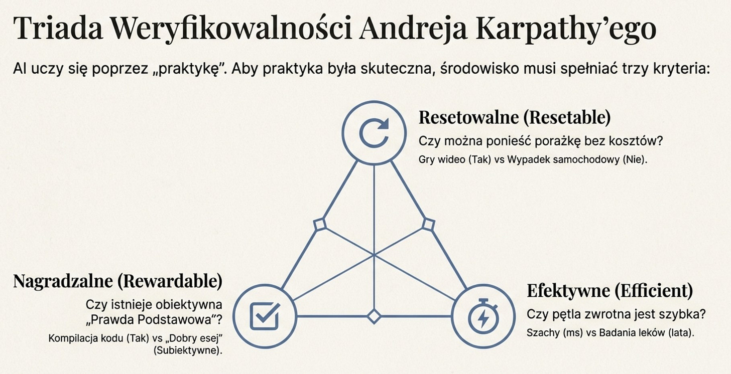 Karpathy argumentuje, że jeśli zadanie jest weryfikowalne, to jest optymalizowalne – bezpośrednio lub przez uczenie ze wzmocnieniem – a sieć neuronowa może zostać wytrenowana do jego doskonałego wykonywania. Chodzi o to, w jakim stopniu AI może „ćwiczyć” dane zadanie. Metafora ćwiczenia jest niezwykle trafna: tak jak pianista doskonali się przez tysiące godzin powtórzeń z natychmiastową informacją zwrotną (fałszywa nuta jest słyszalna od razu), tak AI doskonali się przez miliardy iteracji z automatycznym sygnałem nagrody.