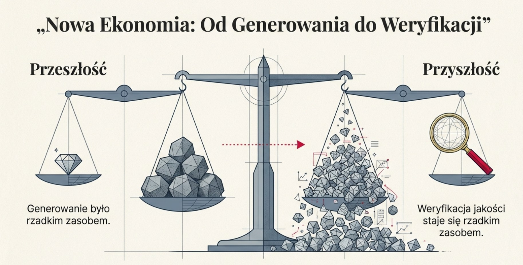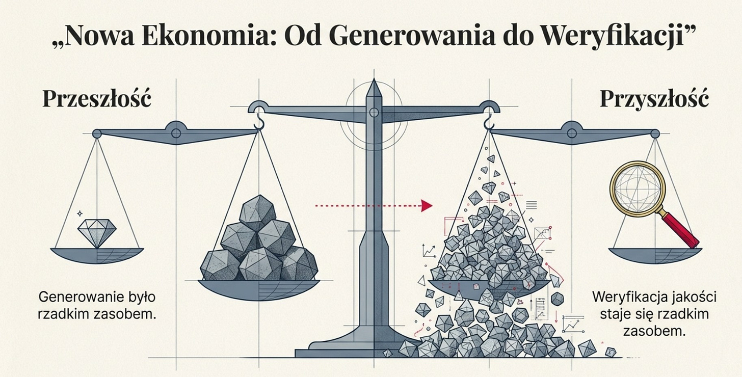 Analiza weryfikowalności prowadzi do głębszego wniosku o naturze pracy w epoce AI. Wchodzimy w erę, którą można nazwać „ekonomią weryfikacji”. Gdy koszt generowania inteligencji zbliża się do zera – bo generowanie tekstu, obrazów czy kodu przez AI jest niemal darmowe – wartość weryfikowania tej inteligencji rośnie nieproporcjonalnie.